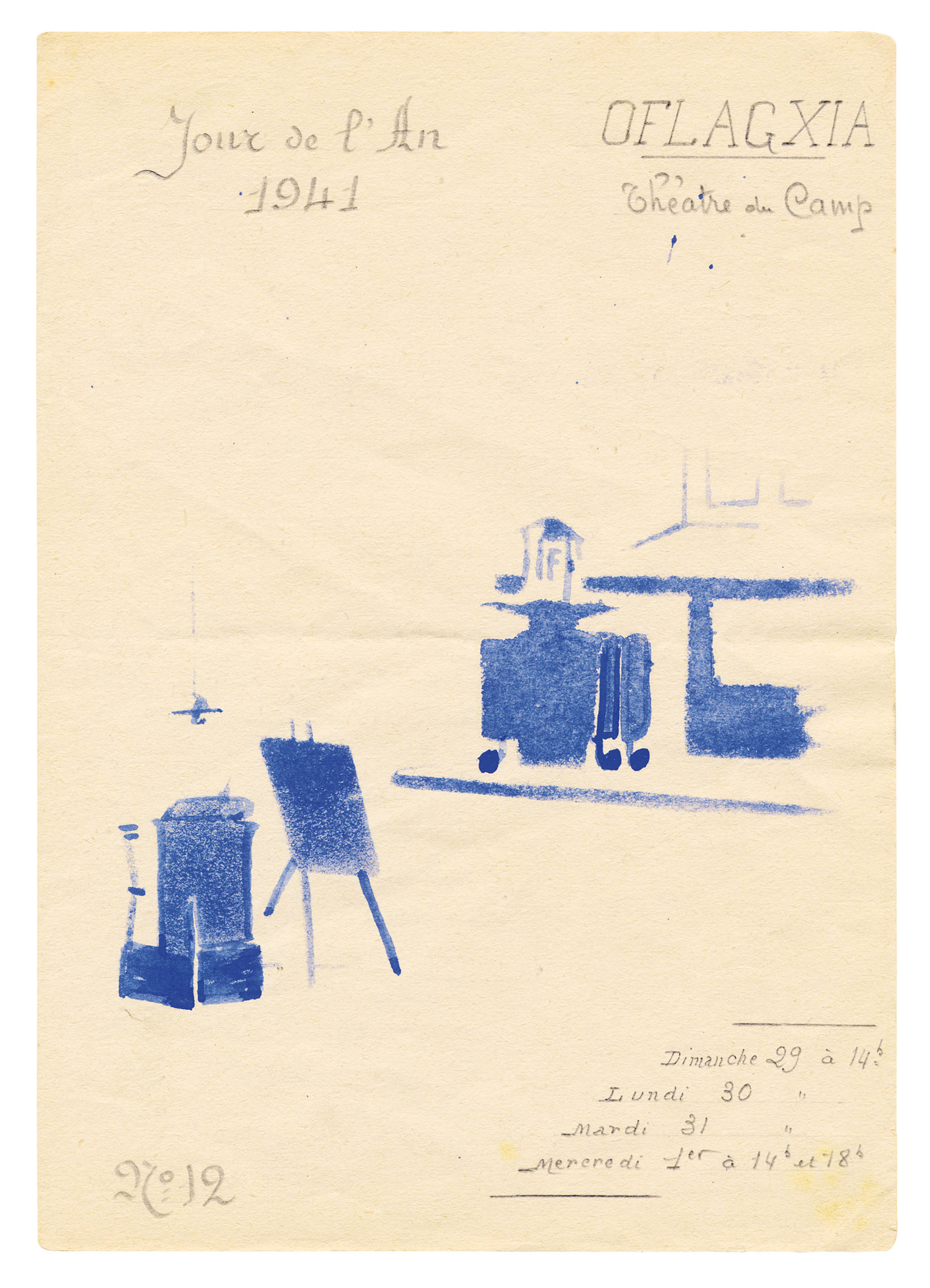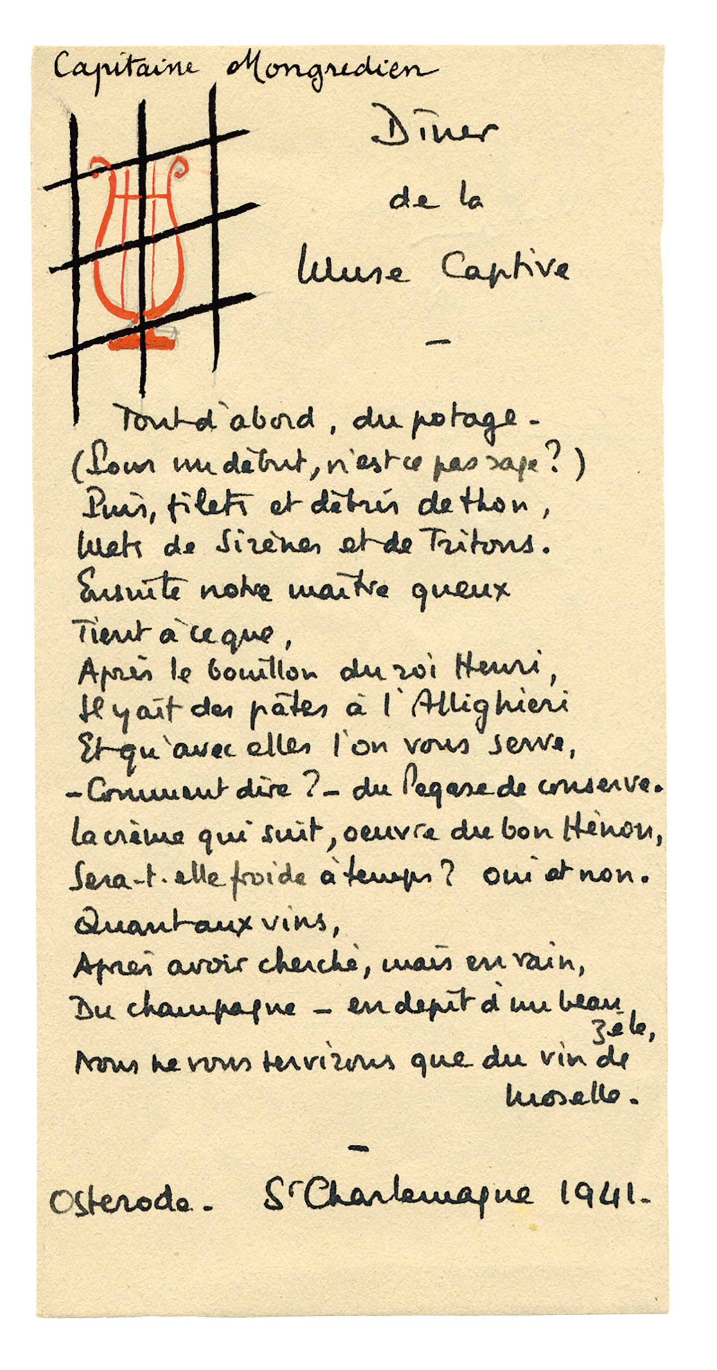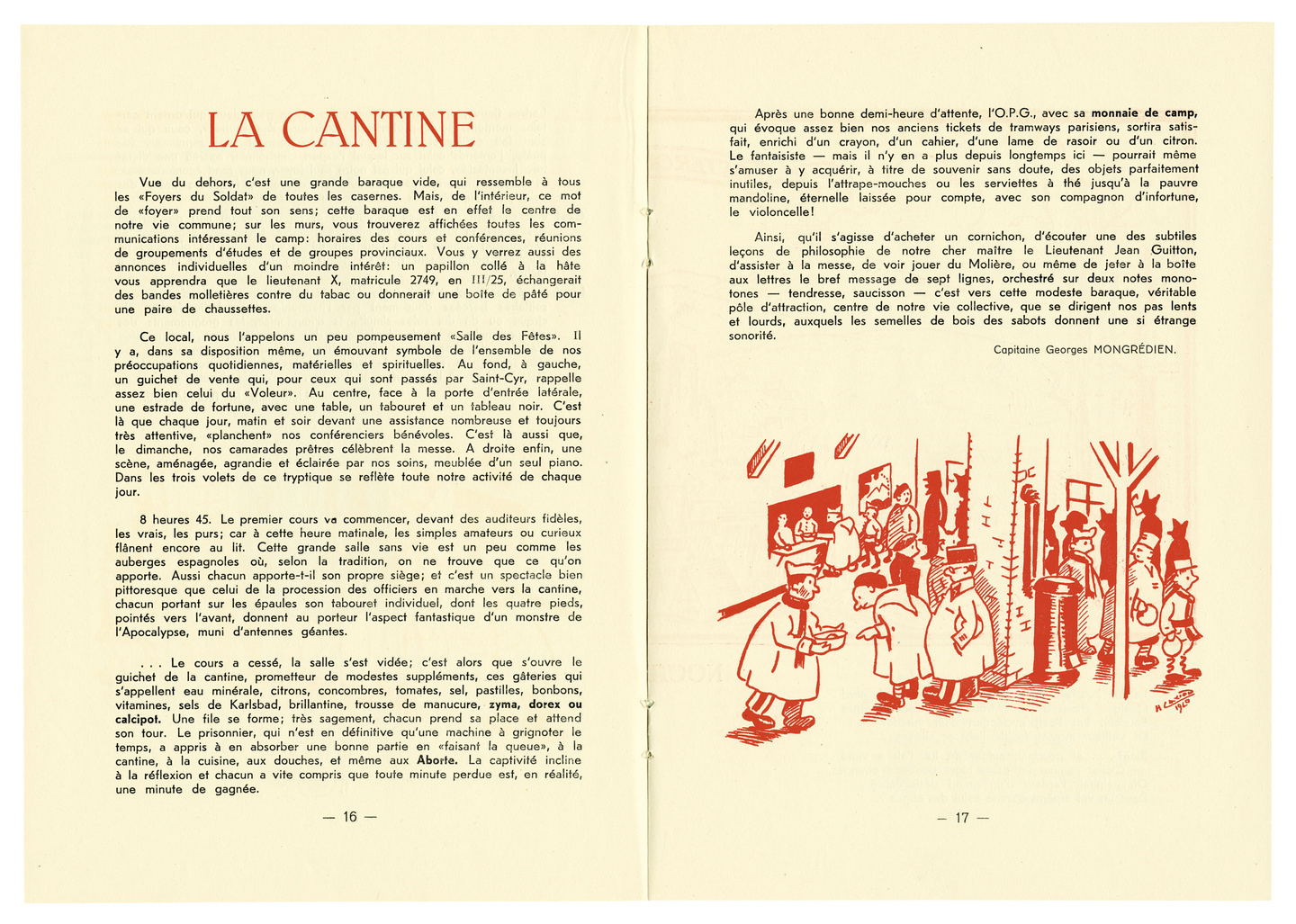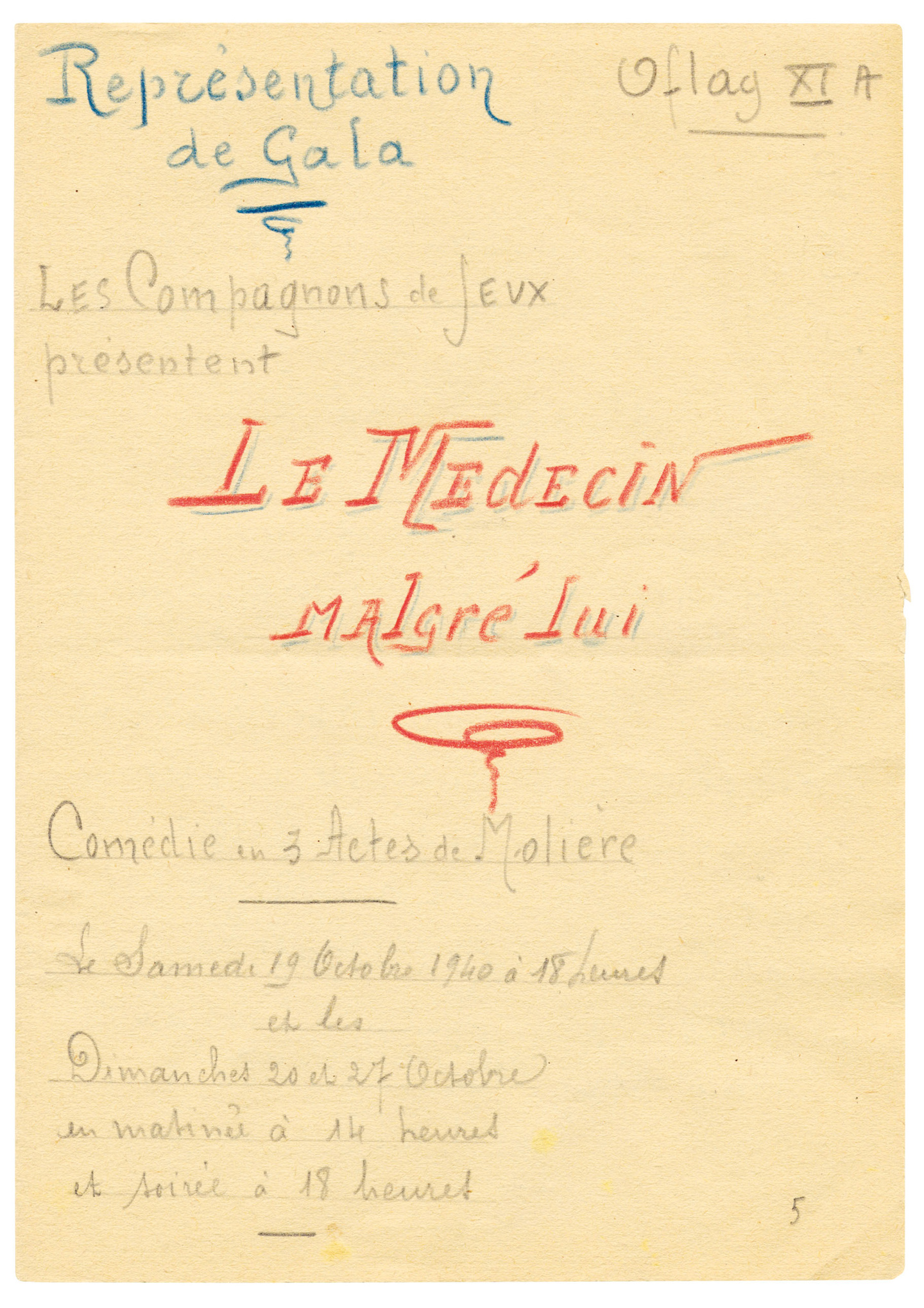 Georges Mongrédien (1901-1980), historien prolixe, spécialiste de la vie littéraire et du théâtre au XVIIe siècle, fut captif en tant qu’officier durant toute la Seconde Guerre mondiale. L’expérience de l’enfermement a suscité en lui le besoin non seulement d’écrire au quotidien, mais aussi celui de reconstituer une véritable vie intellectuelle et artistique au sein du même camp. En archiviste de lui-même, Georges Mongrédien a pris soin de conserver les documents représentatifs de cette extraordinaire activité littéraire et culturelle : programmes et photos de théâtre, journaux, menus de soirées de remise de prix littéraires, billets de « croisières » musicales…