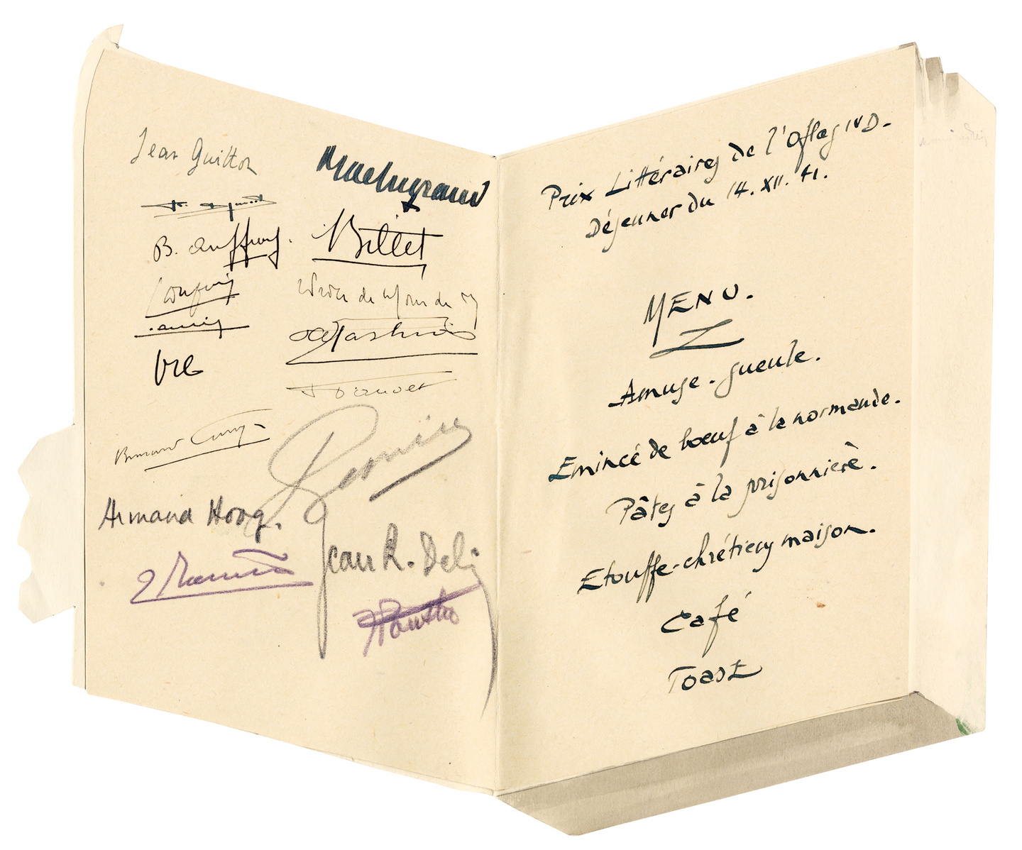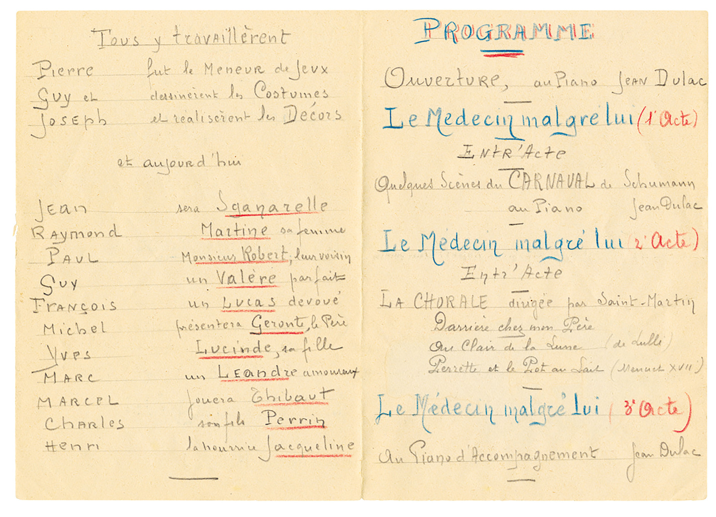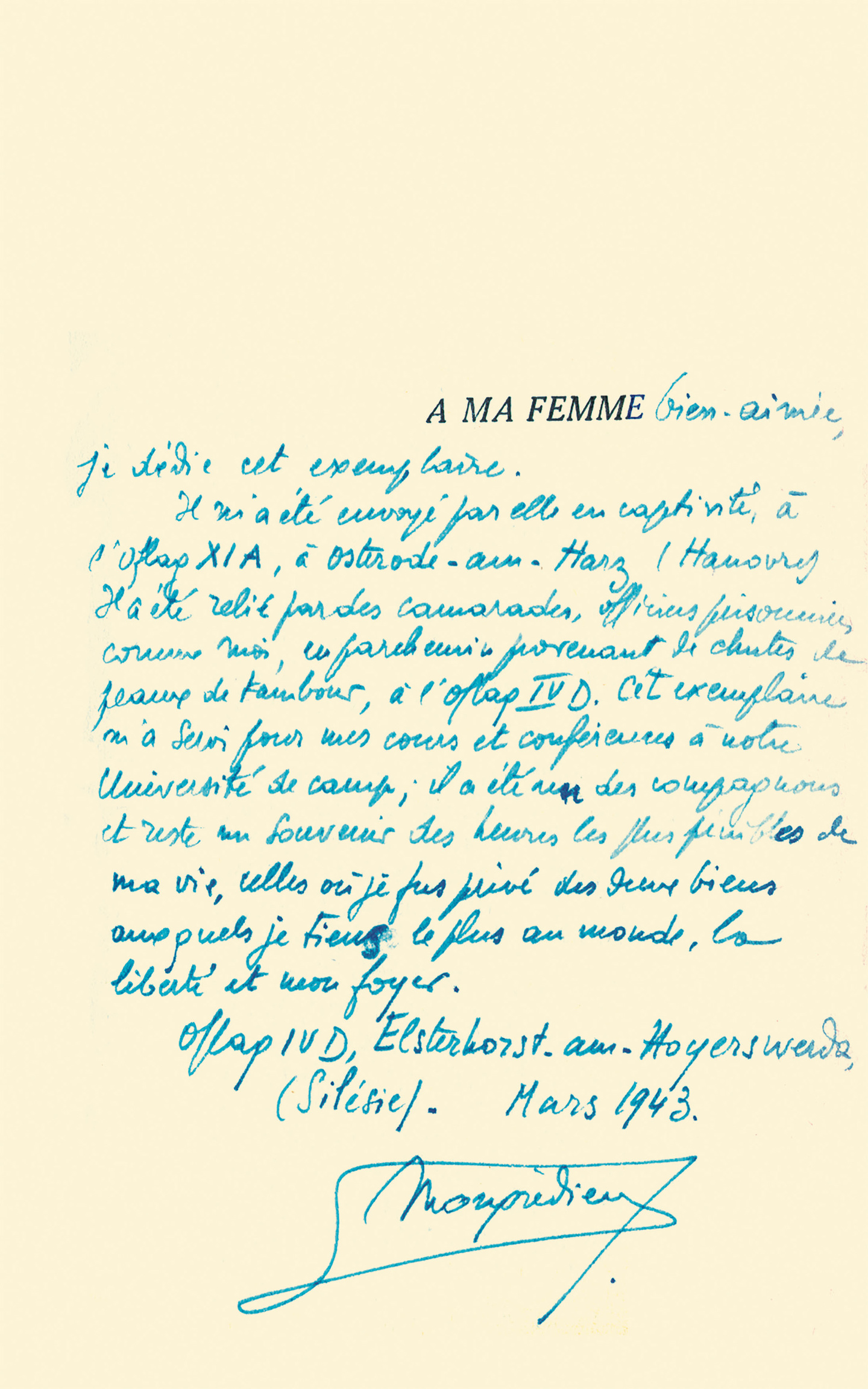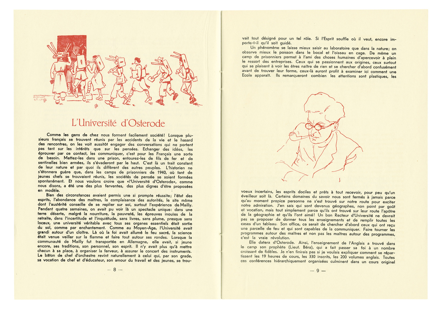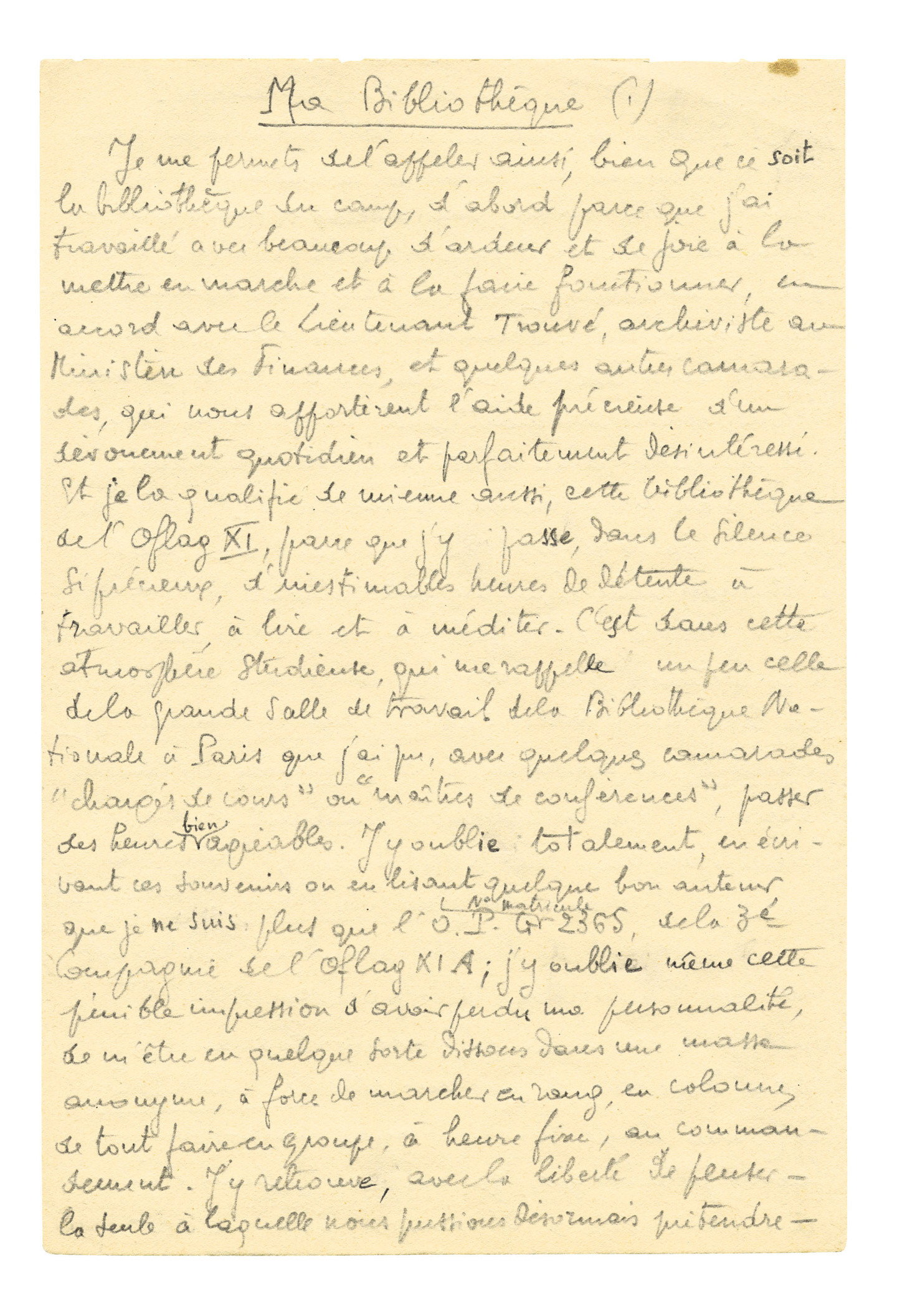 Georges Mongrédien (1901-1980), historien prolixe, spécialiste de la vie littéraire et du théâtre au XVIIe siècle, fut captif en tant qu’officier durant toute la Seconde Guerre mondiale. L’expérience de l’enfermement a suscité en lui le besoin non seulement d’écrire au quotidien, mais aussi celui de reconstituer une véritable vie intellectuelle et artistique au sein du même camp. En archiviste de lui-même, Georges Mongrédien a pris soin de conserver les documents représentatifs de cette extraordinaire activité littéraire et culturelle : programmes et photos de théâtre, journaux, menus de soirées de remise de prix littéraires, billets de « croisières » musicales…