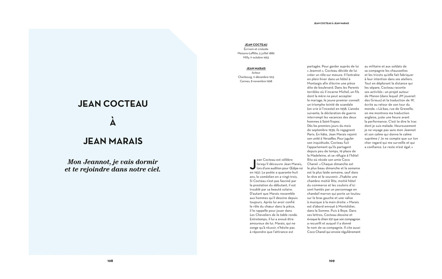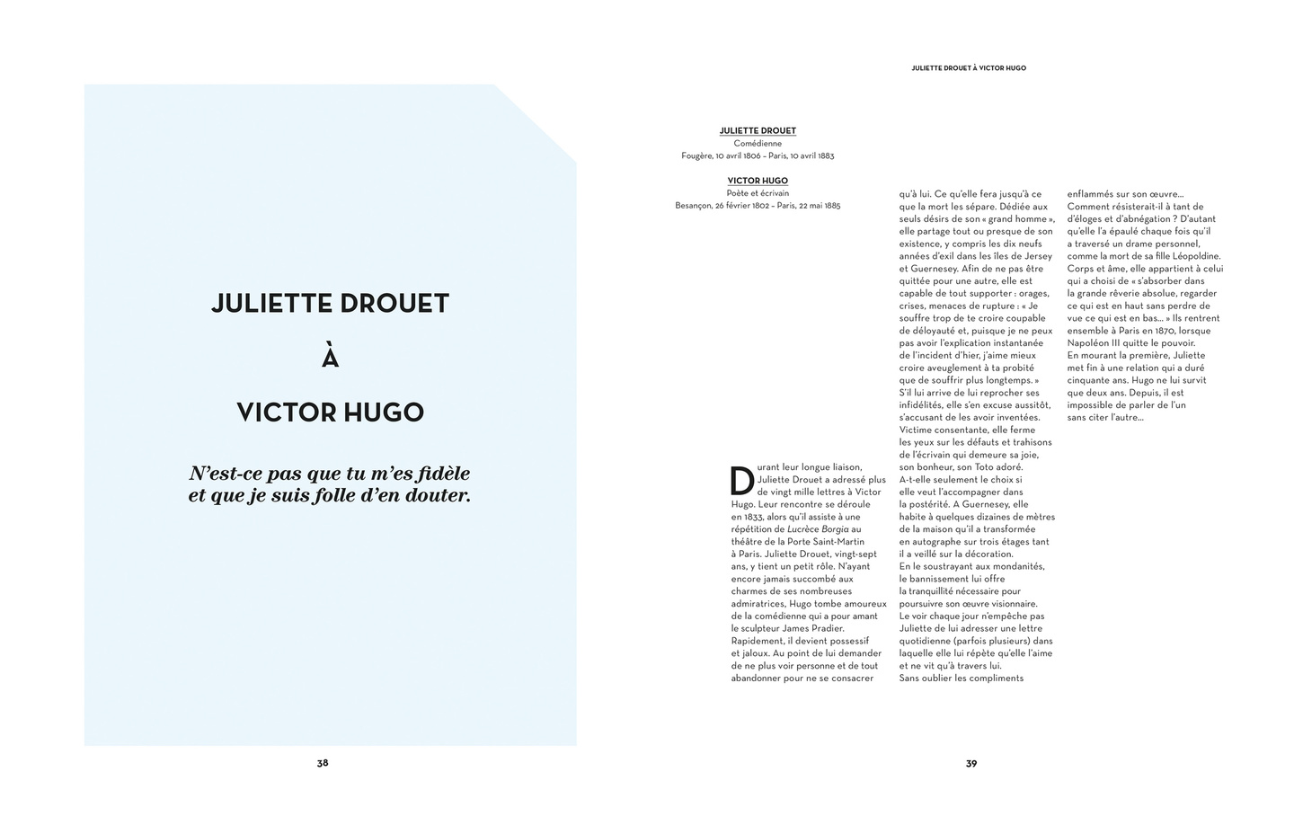 Avec les lettres de : Napoléon Bonaparte à Joséphine, Alfred de Musset à Madame Jaubert, Chopin à George Sand, Gustave Flaubert à Louise Colet, Juliette Drouet à Victor Hugo, Alexandre II à Ekaterina Dolgorouki, Ekaterina Dolgorouki à Alexandre II, Léon Bloy à Jeanne Molbech, Émile Zola à Alexandrine Zola et Jeanne Rozrot, Guillaume Apollinaire à Lou, Jean Cocteau à Marie Scheikevitch, Jean Marais et Natalie Paley, Francis Picabia à Germaine Everling, Puccini à Rose Ader, Jacques Prévert à Claudy Carter, Antoine de Saint-Exupéry à une inconnue, Marcel Jouhandeau à Robert Coquet, Marcel Cerdan à Édith Piaf, Édith Piaf à Louis Gérardin.