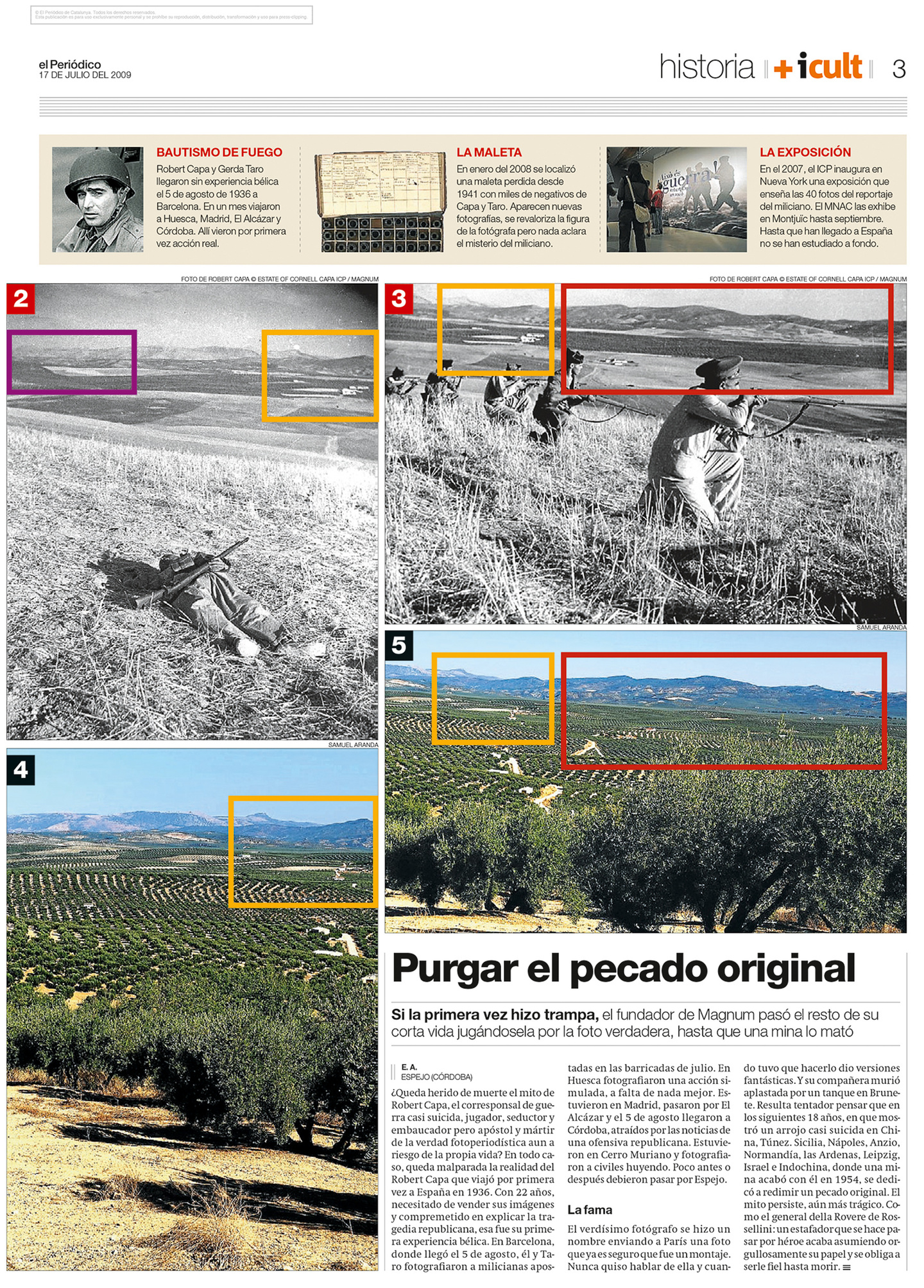 Cette célèbre photographie montrant un soldat républicain frappé de plein fouet par une balle pendant la guerre d’Espagne (1936-1939) aurait été prise par Robert Capa le 5 septembre 1936 près de Cerro Muriano. Or, depuis 1970, détracteurs et défendeurs du photographe se disputent la vérité sur les lieux du drame, l’identité du milicien tué et la séquence des clichés réalisés. Mise en scène ou mort en directe ? Cette image est l’objet d’un des plus longs procès du photojournalisme.
