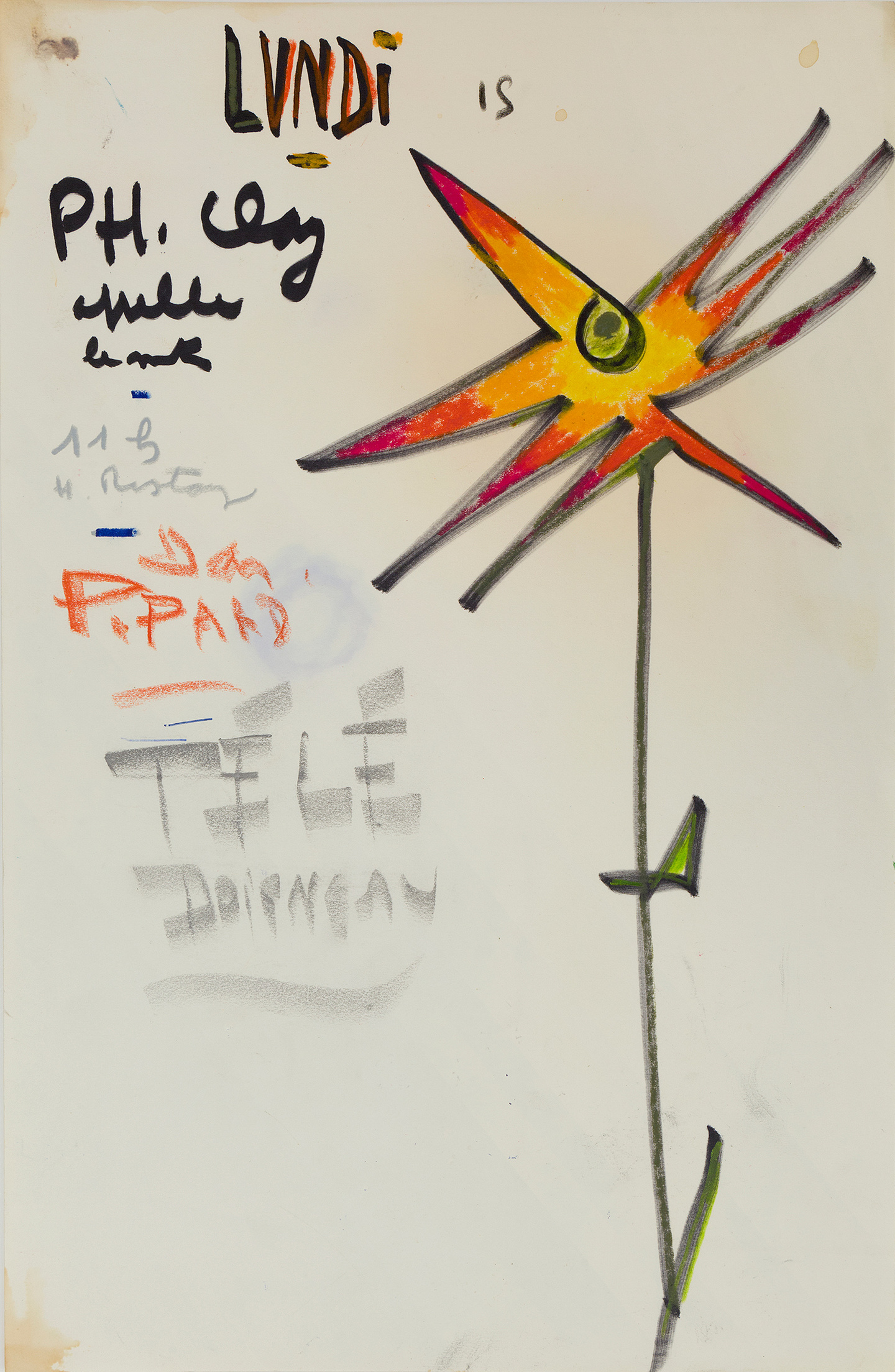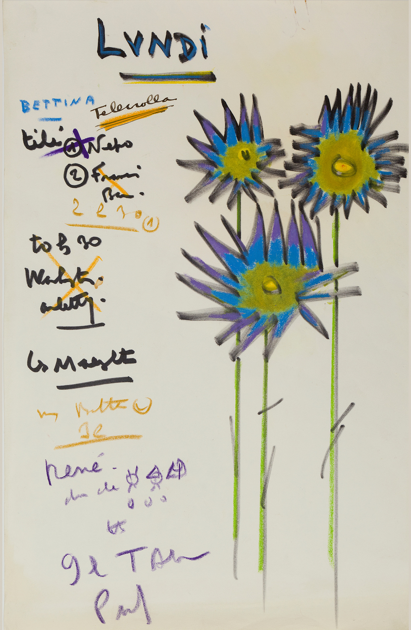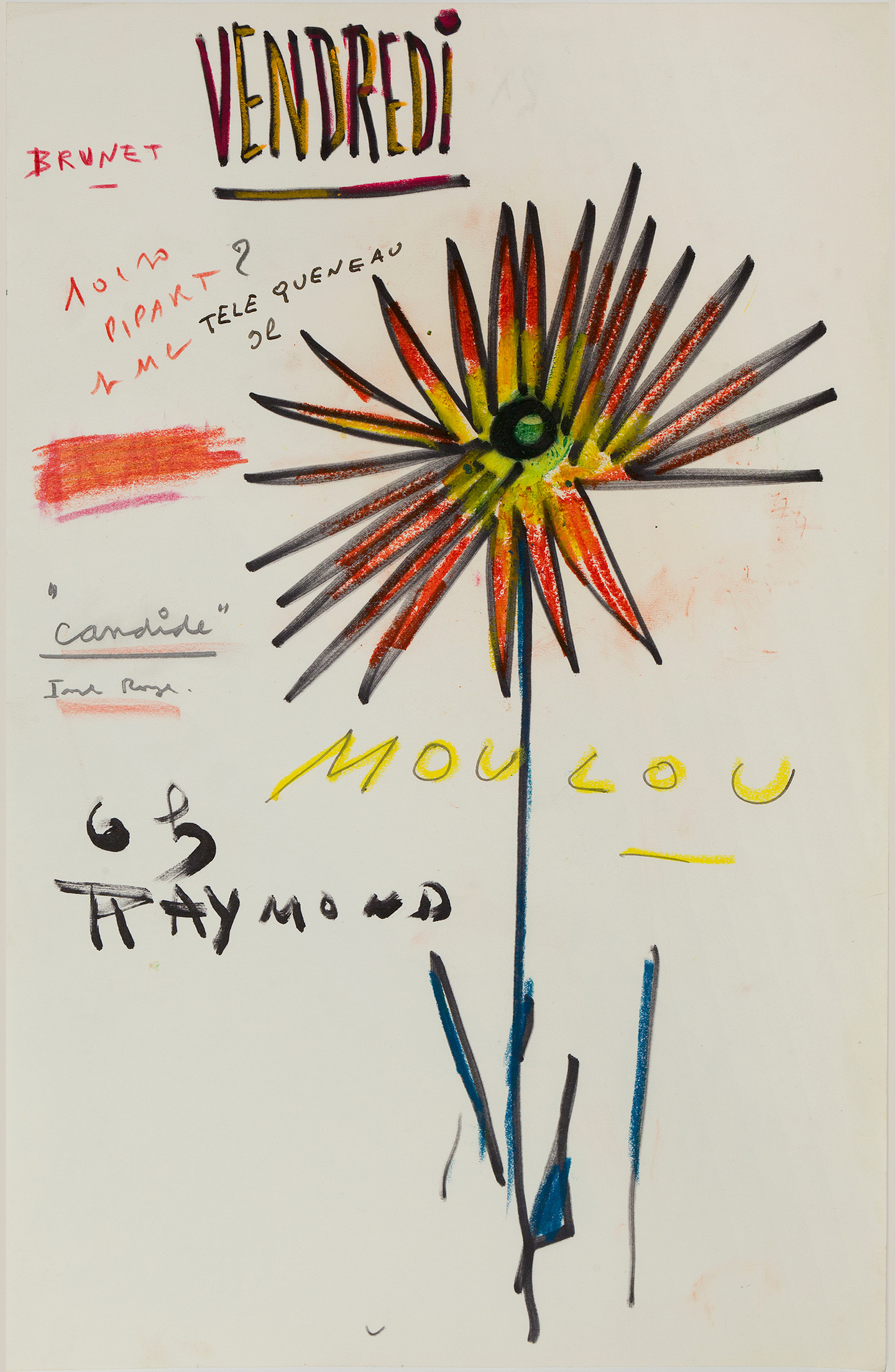 Anniversaire, rendez-vous, dîners entre amis, Prévert plaçait l’amitié au centre de sa vie. À partir de la fin des années 1950, installé cité Véron, il prend l’habitude d’y consacrer chaque jour une belle éphéméride : une fleur dessinée au feutre et vivement colorée aux côtés de laquelle il notait les noms et souvent l’occasion de ses rendez-vous. Le geste est superbe, le défilé des noms vertigineux… Fidèle à lui-même, Prévert y apparaît taquin et attachant. Sous sa plume facétieuse, Paul Grimault prend l’aspect d’un gros chat jaune, les dîners sont signalés par un couvert dressé et les jours se succèdent dans une curieuse danse typographique, mélangeant les lettres et les couleurs. Réunis en un bouquet éclatant de couleurs et de vie, les éphémérides de Prévert sont ici publiées pour la première fois. Dans une galerie de seize courts portraits, Carole Aurouet raconte les liens qui attachaient Prévert à chacun de ses amis.