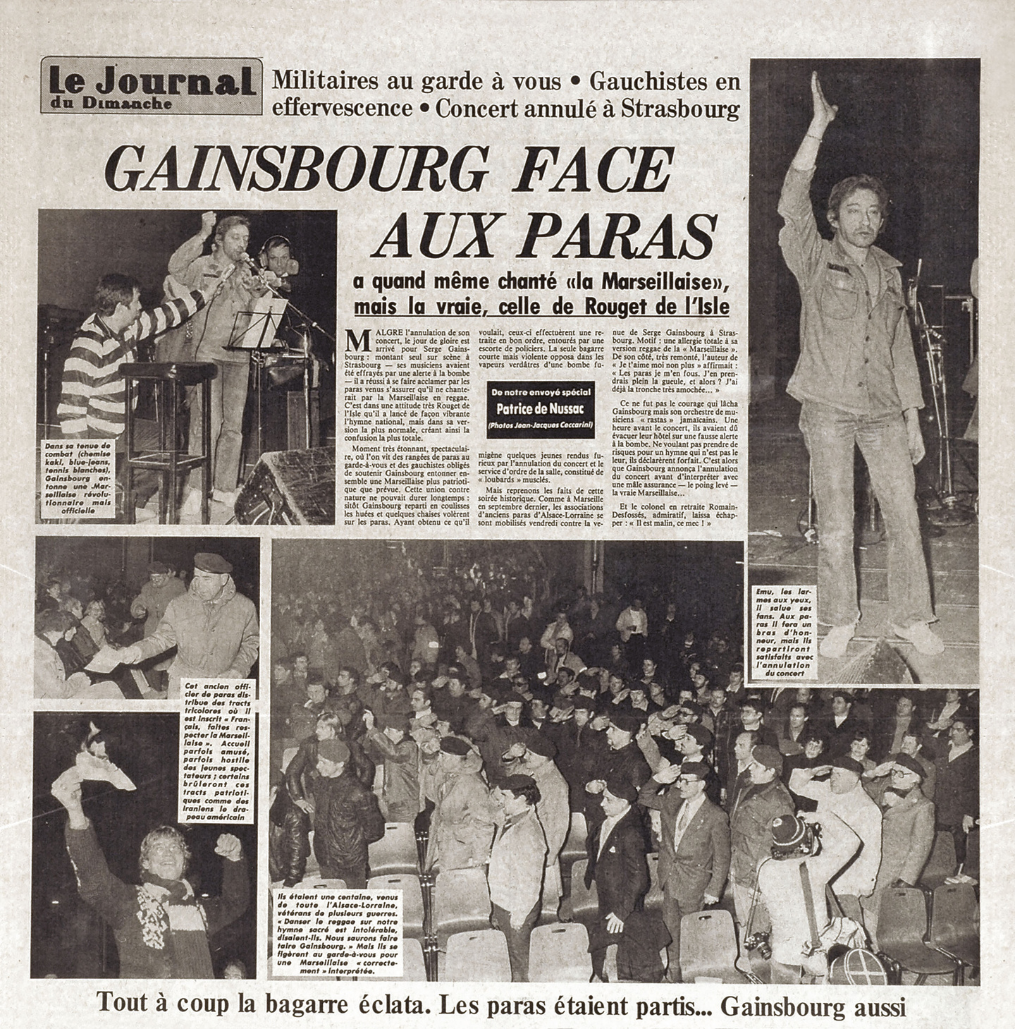 Chronique d’un « blasphème républicain » sur fond d’antisémitisme. Ce fut un scandale retentissant : La Marseillaise version reggae interprétée par Gainsbourg, sous le titre Aux armes et cætera. Un édito du très conservateur Michel Droit dans le Figaro Magazine du 1er juin 1979 met le feu aux poudres en attaquant Gainsbourg en tant que juif, lui reprochant de provoquer l’antisémitisme. C’est l’anatomie de ce scandale – vécu comme un drame personnel par Gainsbourg – que présente ici Laurent Balandras, fac-similés d’archives à l’appui, à partir du dossier que le chanteur avait lui-même conservé chez lui : lettres d’insultes, lettres de soutien, articles de presse retraçant notamment l’épisode du fameux concert de Strasbourg annulé sous la menace des paras.