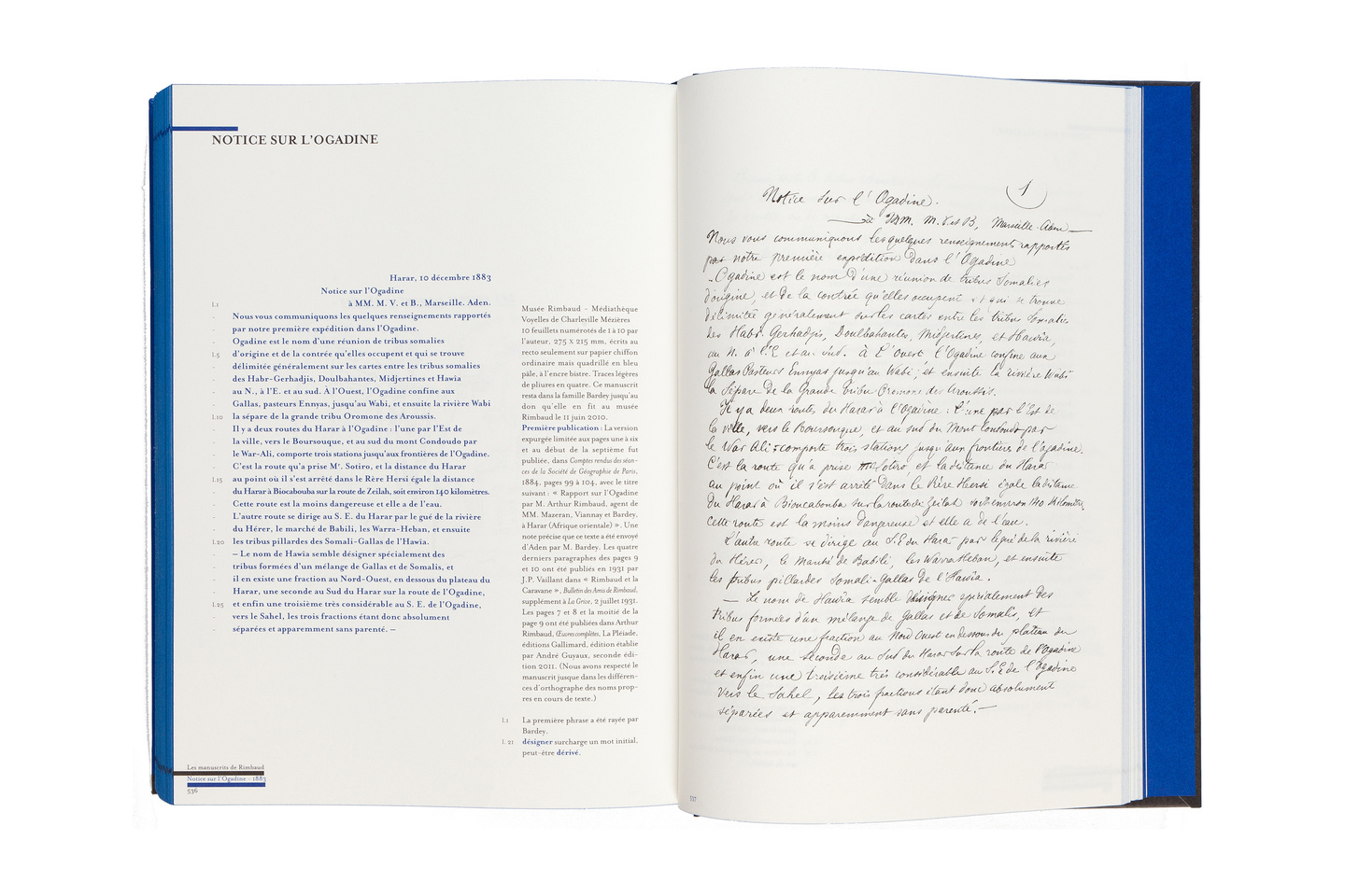 L’émotion est exaltée par la complicité qui naît avec cet extraordinaire ensemble de fac-similés. Les dernières collections privées ont désormais renoncé au secret. Cette édition est donc définitive : elle contient non seulement de nouveaux textes (Qu’est-ce pour nous mon cœur, Michel et Christine, Plates-bandes d’Amarante, Honte) mais aussi de nombreuses variantes. Nous reproduisons aussi pour la première fois le Rapport sur l’Ogadine car il est un exemple fondamental de la nouvelle « œuvre » que Rimbaud avait voulu construire en corne de l’Afrique : travail rigoureux, description objective, précision « scientifique ». Le trait maîtrisé révèle les tensions intérieures, les enfermements, la violence à soi-même, en soi-même. La magie de Rimbaud et son drame. Depuis plus de vingt ans désormais et 7 livres consacrés à Rimbaud aux Éditions Textuel, Claude Jeancolas marche aux côtés du poète et enquête avec patience et détermination pour comprendre ce « phénomène Rimbaud ».