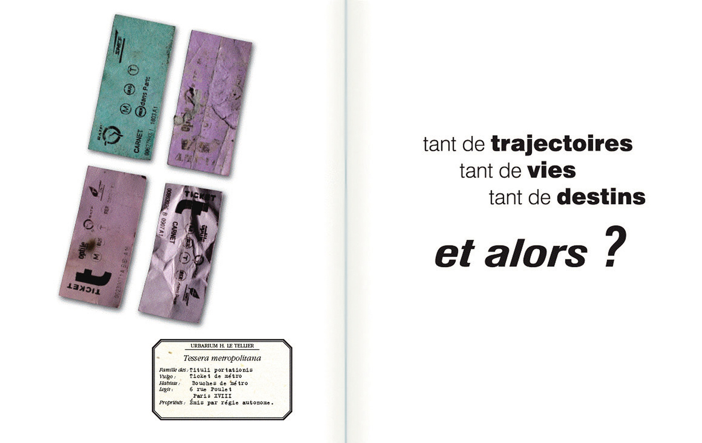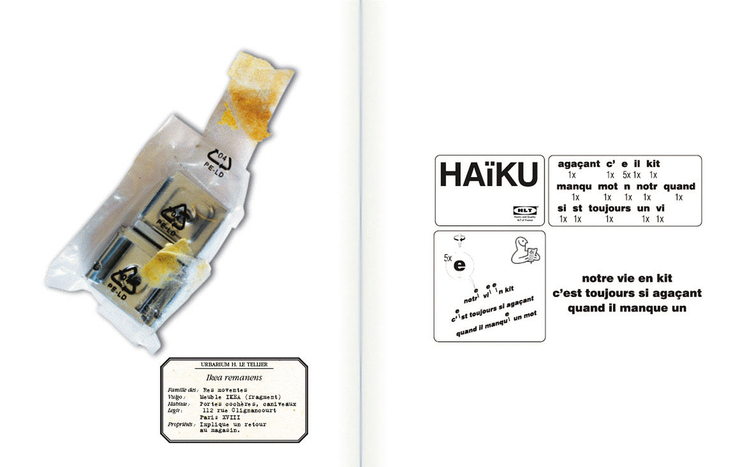 « Tordeur de mots et détrousseur de phrases l’oulipien Hervé Le Tellier s’est amusé à composer des haïkus inspirés d’une quarantaine d’objets triés trainant sur nos trottoirs, en ajoutant un quatrième vers qui sonne comme la réponse d’une charade. Photos d’une canette de soda froissée, d’emballages de Malabar, d’un cahier d’écolier jeté ou égaré, clichés de piles usagées, de photos d’identité maculées, d’un formulaire en tamoul… » Le Figaro Littéraire