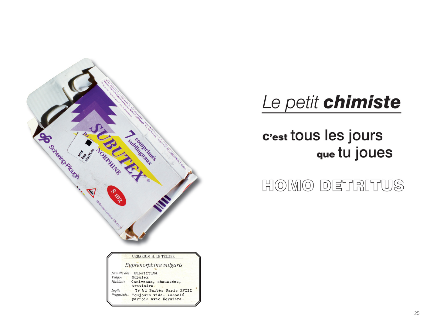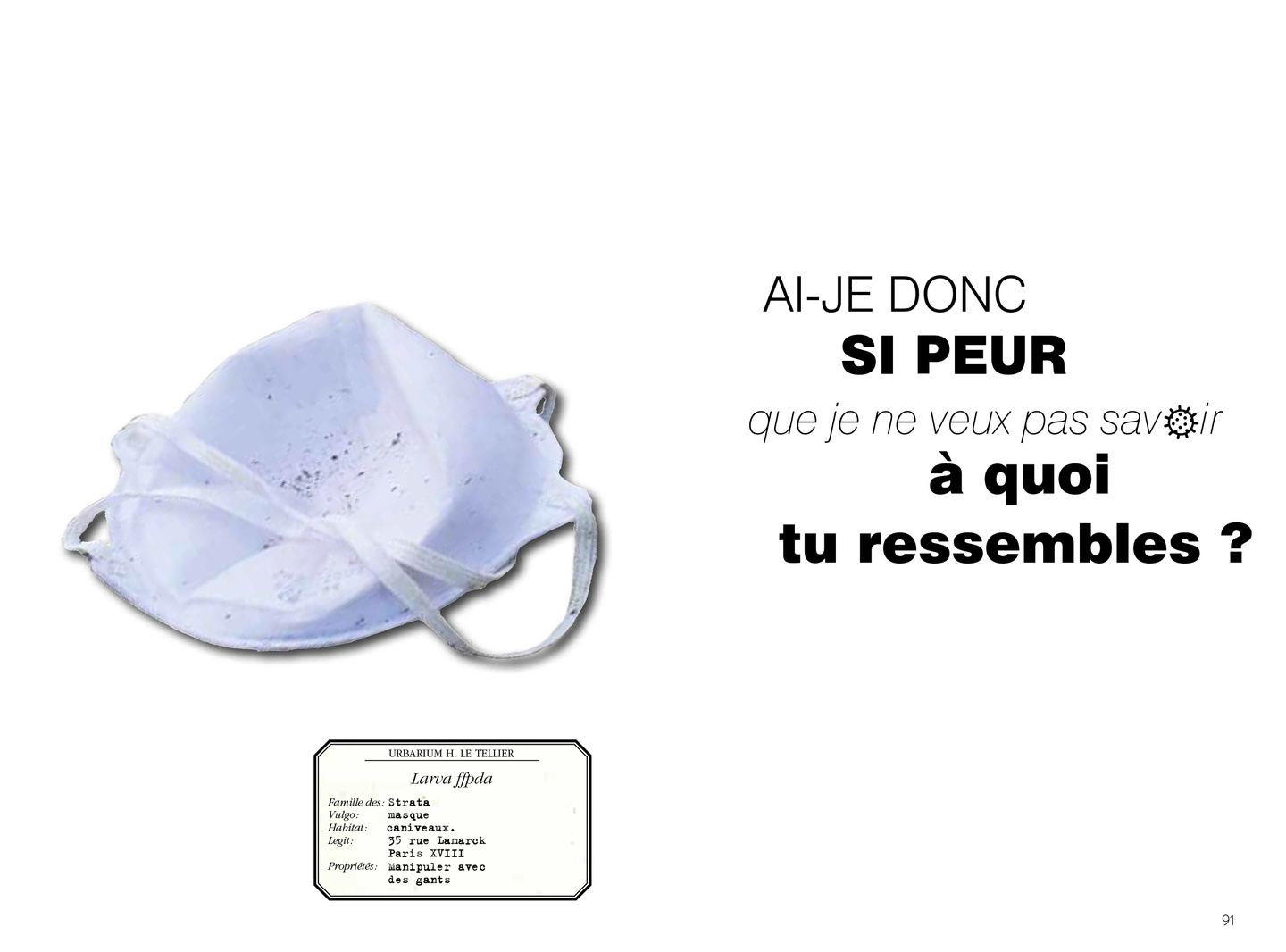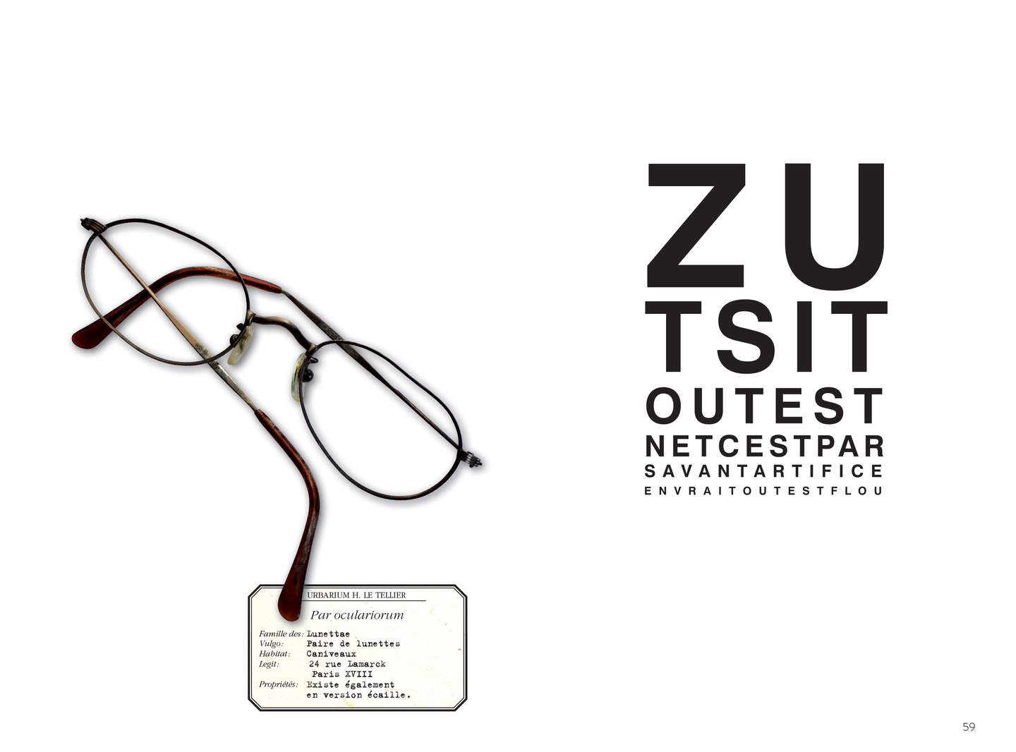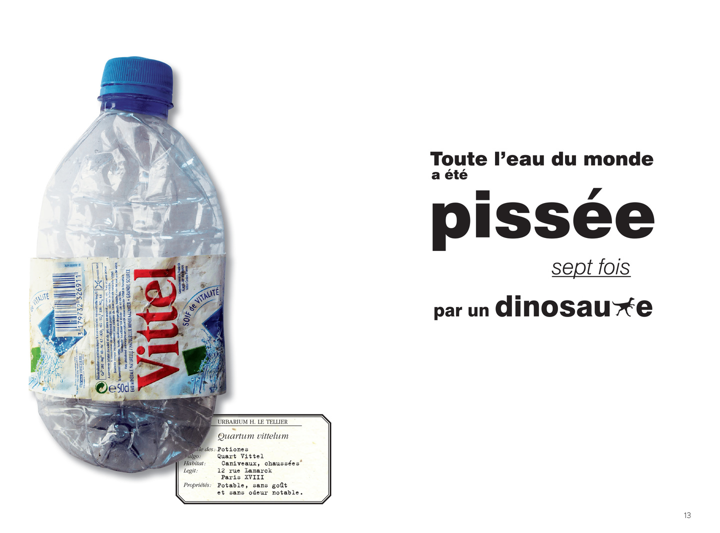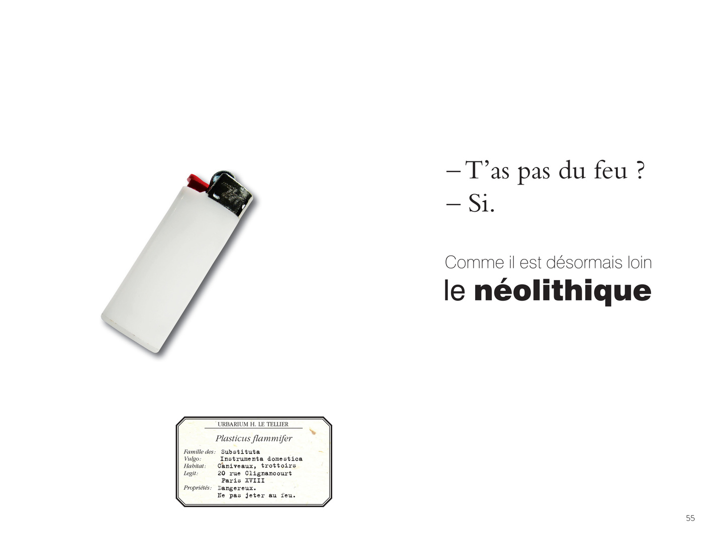 40 + 1 objets du quotidien abandonnés sur nos trottoirs sauvés du néant par Hervé Le Tellier. En l’honneur de ces bribes de nos vies, Le Tellier a conçu une étiquette érudite obéissant aux règles de l’herbier et composé un haïku, cette forme littéraire minimale, soumise au rythme syllabique 5-7-5 : 697 syllabes en tout.