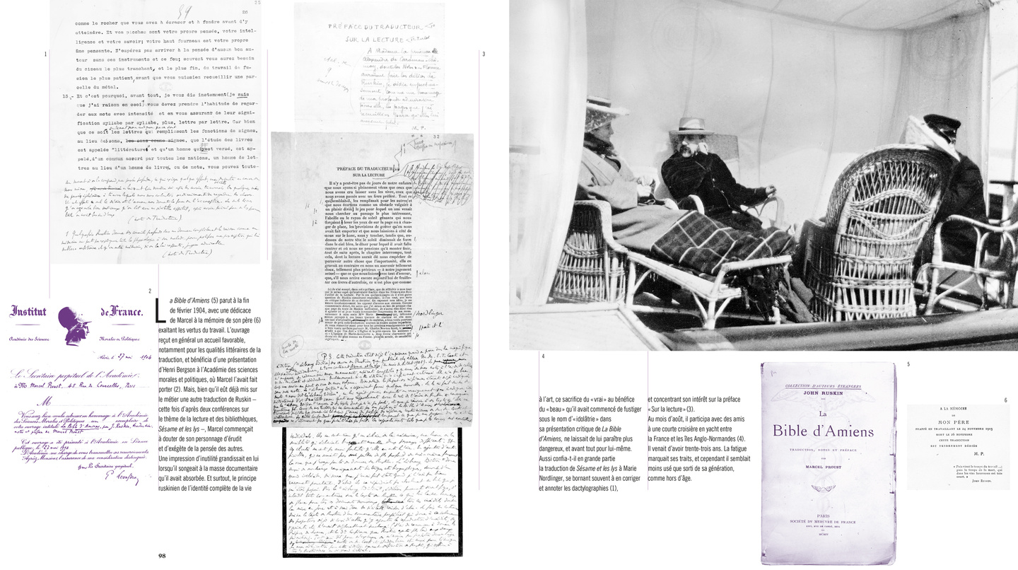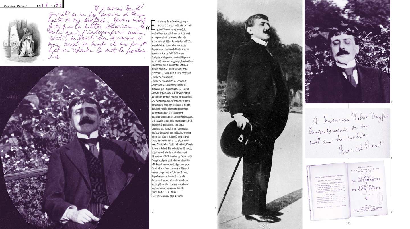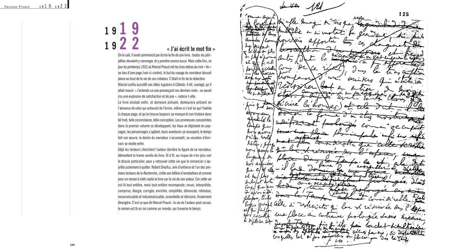 Cette biographie illustrée reconstitue à travers 700 documents le monde de Marcel Proust. L’évolution de son univers familial, moral, intellectuel, sentimental, mais aussi les drames du monde contemporain et l’avènement de la modernité. Passion Proust rend visible pour la première fois, grâce à la présentation de nombreux manuscrits, brouillons truffés de notes et de morceaux découpés, cousus, collés, superposés, – les fameuses « paperolles » – la technique révolutionnaire d’écriture de Á la recherche du temps perdu.