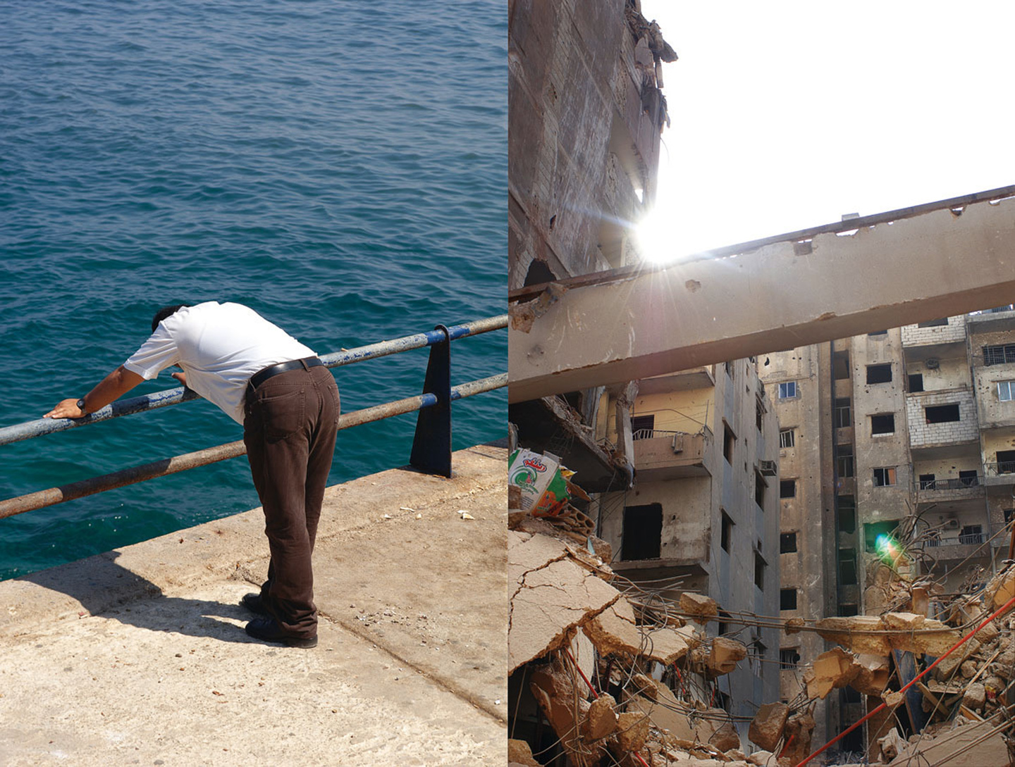 Parti à Beyrouth quelques jours après le cessez-le-feu à l’été 2006, Pascal Colrat en a rapporté plus de 2 000 photographies. Graphiste et photographe sans être reporter de guerre, son art se construit par l’association et la confrontation d’images en doubles pages. Du sud du pays aux banlieues bombardées de la capitale, du Chouf à la rencontre d’artistes libanais et de leurs familles : autant d’images qui disent les contradictions du Liban. Ses douleurs et sa douceur, sa destruction et sa reconstruction. L’ouvrage, drôle et terrible à la fois, révèle le cynisme et l’indicible de cette guerre qui n’en finit pas.