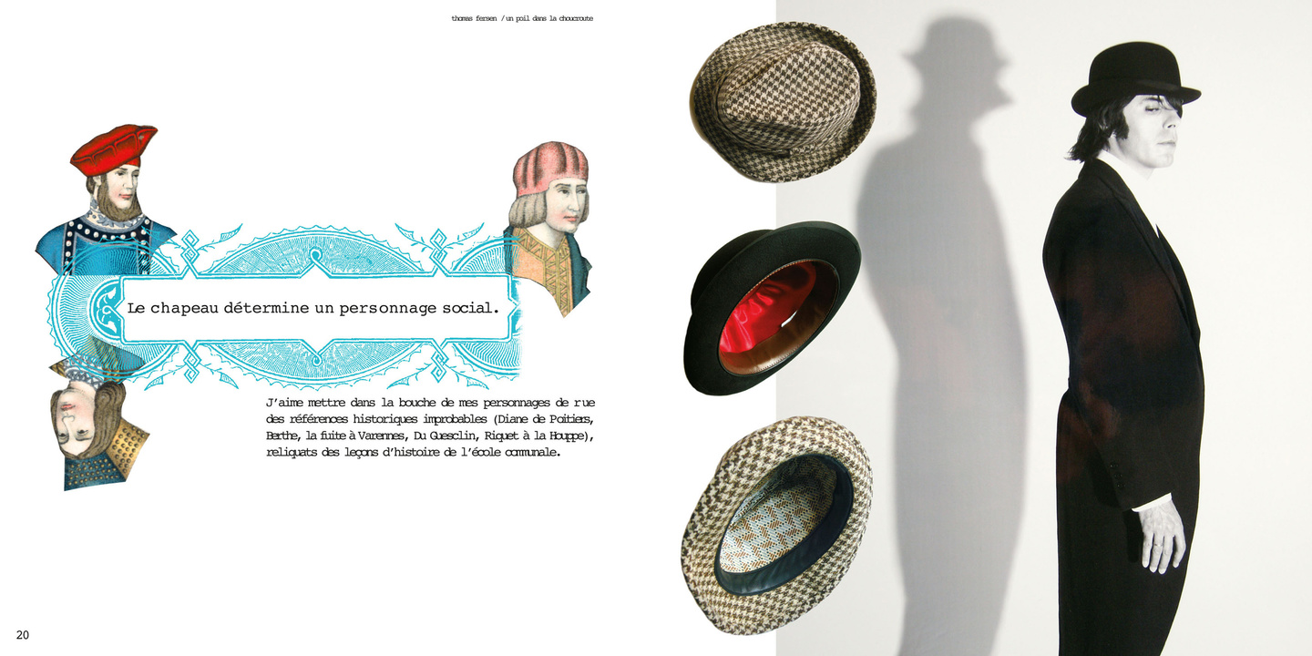Thomas Fersen est un artiste discret pour ne pas dire secret. Cet ouvrage invite à découvrir l’élaboration de son œuvre grâce à des documents inédits et intimes : photos d’enfance, cahiers d’écolier, carnets de travail, notes sur les mises en scène de ses concerts, objets, costumes, instruments, etc. On y suit la difficile genèse de chansons telles que Croque, Les Cravates, Pièce montée des grands jours, Zaza, Mon iguanodon… qui se perdent dans des dédales narratifs avant d’aboutir aux petits concentrés de poésie ciselée que l’on connaît. Thomas Fersen écrit et compose à son rythme, de manière très solitaire, des histoires à la fois truculentes et touchantes où la langue conjugue ses talents : vocabulaire doucement suranné, bestiaires insolites, manières élégantes de dandy, arrangements de guingois et populaires sont les ingrédients de son répertoire.