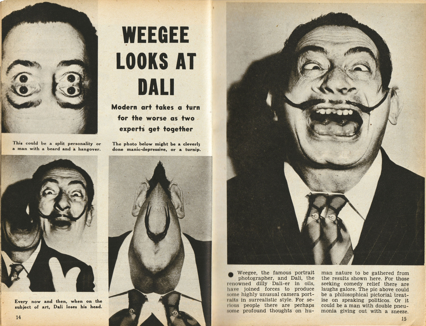 Il y a une énigme Weegee. Ses photographies se répartissent en deux catégories distinctes. Il y a d’une part ses images de faits divers prises à New York au cours des années 1940, dans une approche documentaire, directe et crue. Et de l’autre, des photographies de starlettes, politiciens et autres mondains réalisées àHollywood dans la décennie suivante, pour lesquelles il a volontiers recours aux trucages.